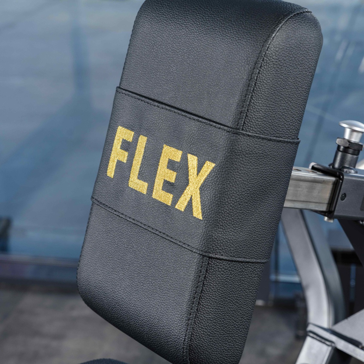 Спинка эргономичной формы длиной 340 мм и шириной 190 мм имеет мягкие закругления в зонах контакта с корпусом спортсмена. Поверхность обтянута износостойкой искусственной кожей, на центральной части расположена декоративная накладка с вышивкой FLEX.