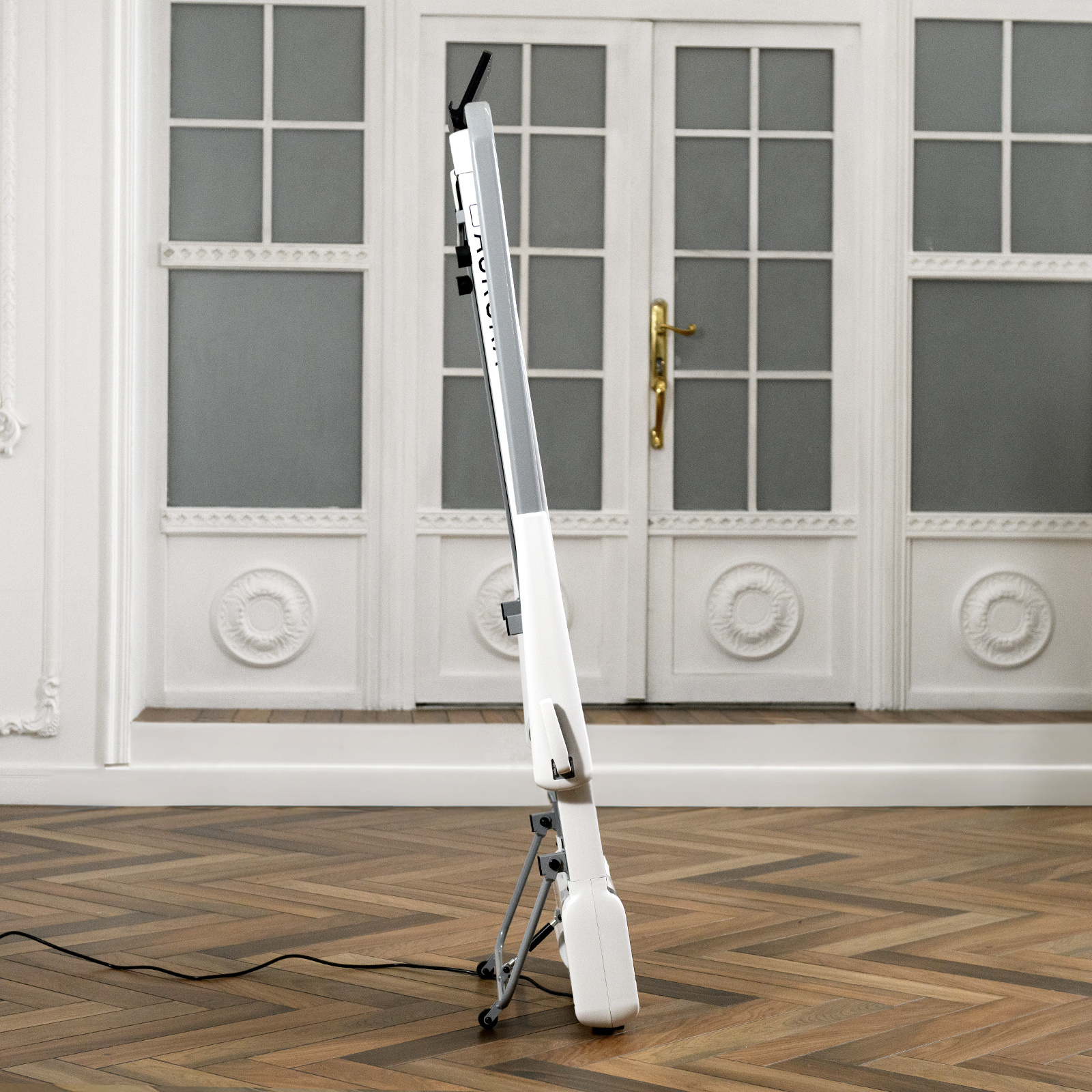 Модель имеет складную конструкцию с возможностью вертикального хранения, что экономит пространство в помещении. Максимальный вес пользователя составляет 100 кг.