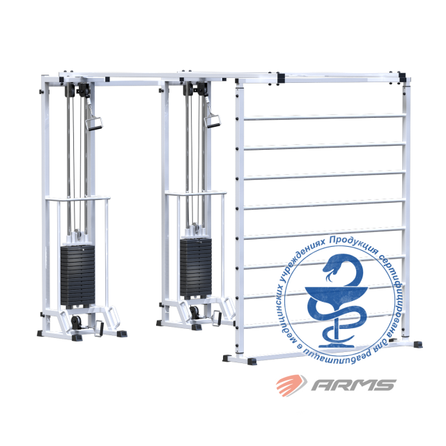 Грузоблочный стек тренажера состоит из металлических обрезиненных плит весом по 5кг, и хромированных направляющих. Изменение нагрузки происходит при помощи металлической иглы(фиксатора). Для приведения в движение грузов используется трос 5 мм в пвх оплетке с усилием на разрыв 500 кг с максимальной нагрузкой – 800кг.