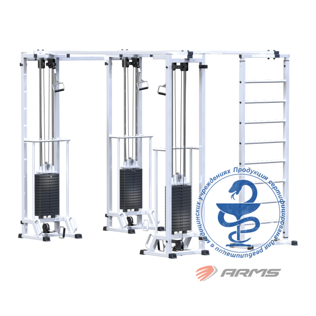 Грузоблочный стек тренажера состоит из металлических обрезиненных плит весом по 5кг, и хромированных направляющих. Изменение нагрузки происходит при помощи металлической иглы(фиксатора). Для приведения в движение грузов используется трос 5 мм в пвх оплетке с усилием на разрыв 500 кг с максимальной нагрузкой – 800кг.