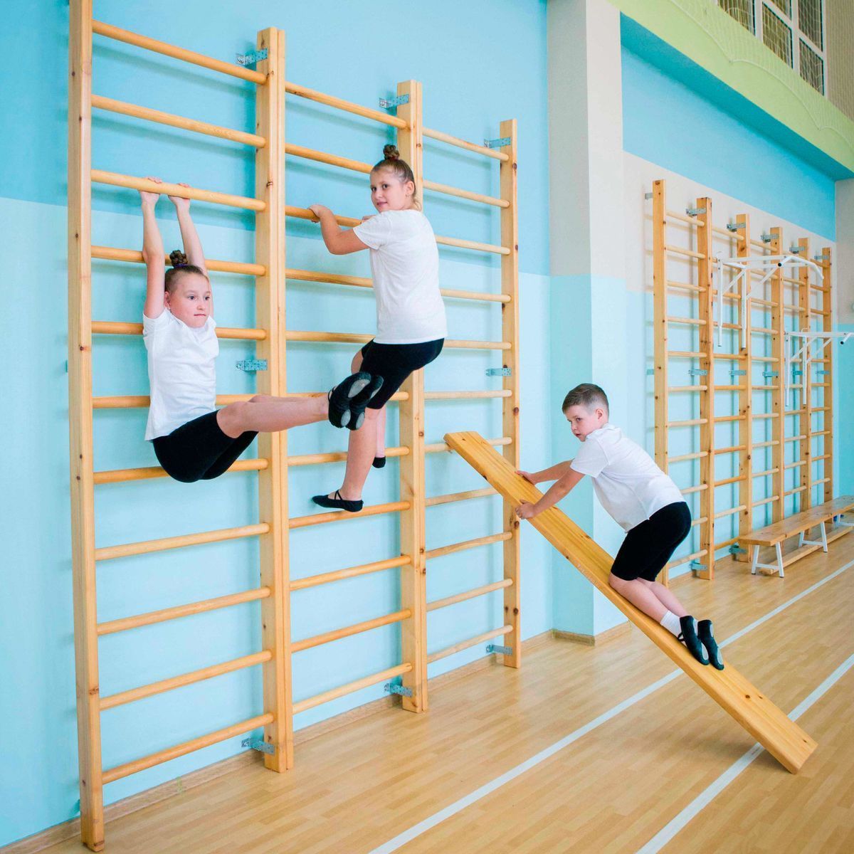 Доска наклонная гладкая выполнена из клееной древесины толщиной 40 мм с 2 металлическими крючками для крепления к гимнастической стенке.
