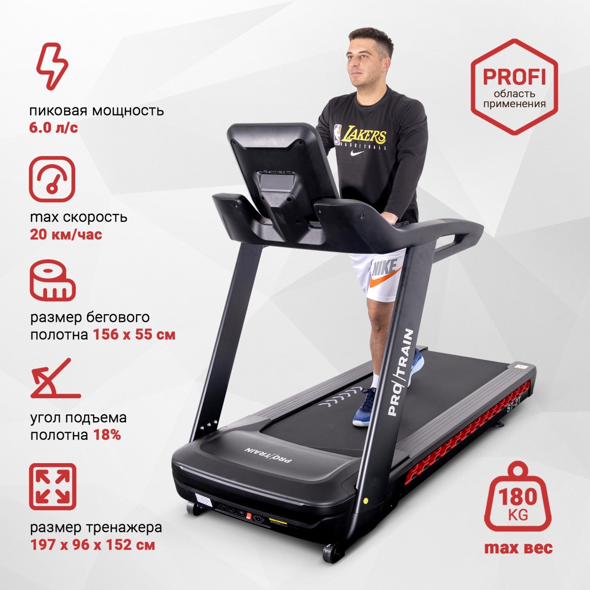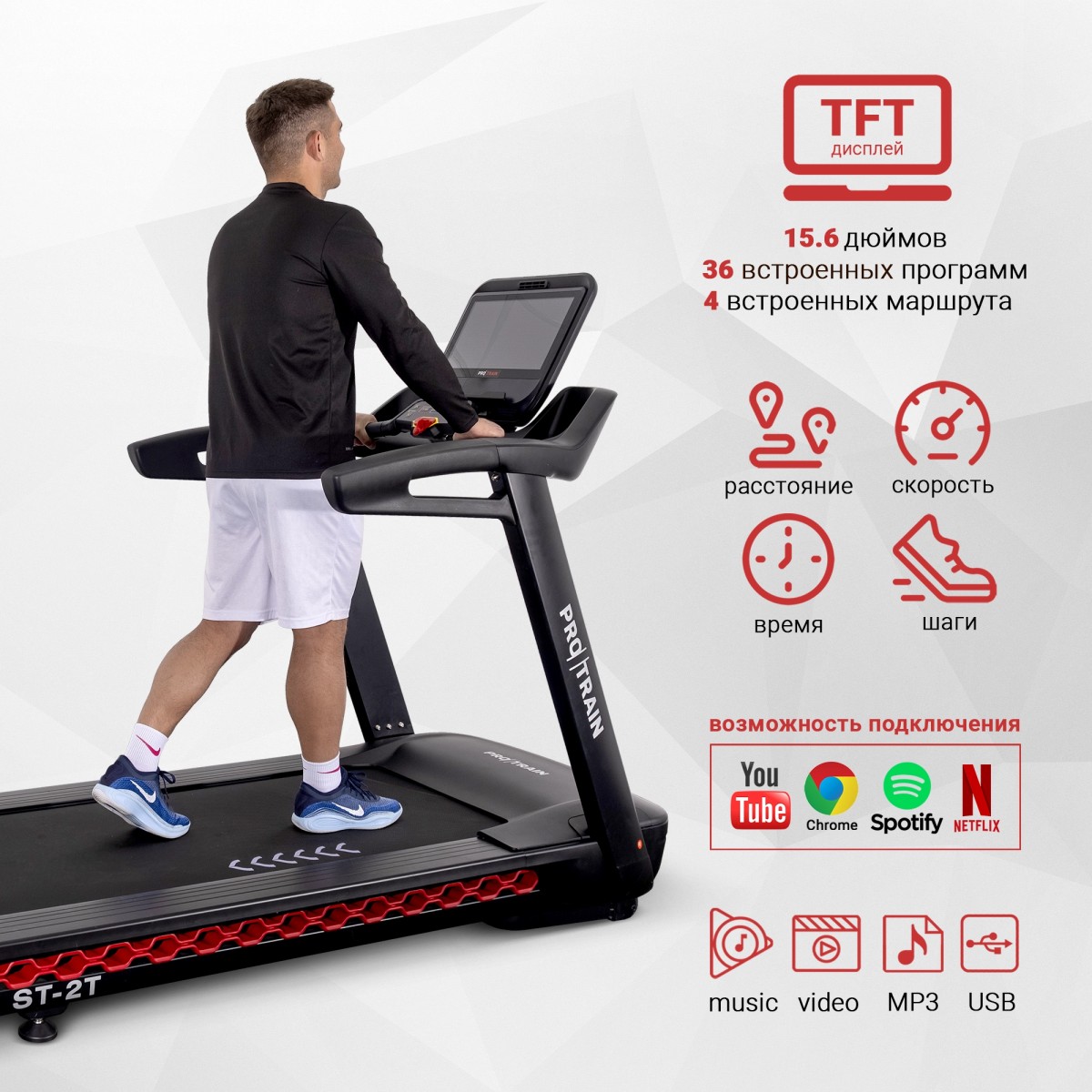 Беговая дорожка Protrain ST-2T с двигателем мощностью 3 лошадиных силы (пиковая мощность — 6 л.с.) позволяет пользователям разгоняться до 20 км/ч. Большое беговое полотно толщиной 2.8 мм для снижения степени износа и длительной эксплуатации.Область применения: профессиональная;Мощность двигателя: 3 л.с;Максимальный вес пользователя: 180 кг;Длина полотна: 156 см;Ширина полотна: 55 см;Скорость: 20 км/ч; Угол наклона: 18%; Консоль/дисплей:TFT-дисплей;Программы и функции: 12 групп предустановленных программ;Размеры товара в сборе: 197 х 96 х 152 см.