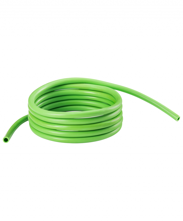 Эспандер зеленого цвета подойдет тем, кто недавно начал заниматься с подобными резиновыми трубками. Поможет постепенно развивать выносливость мышц.