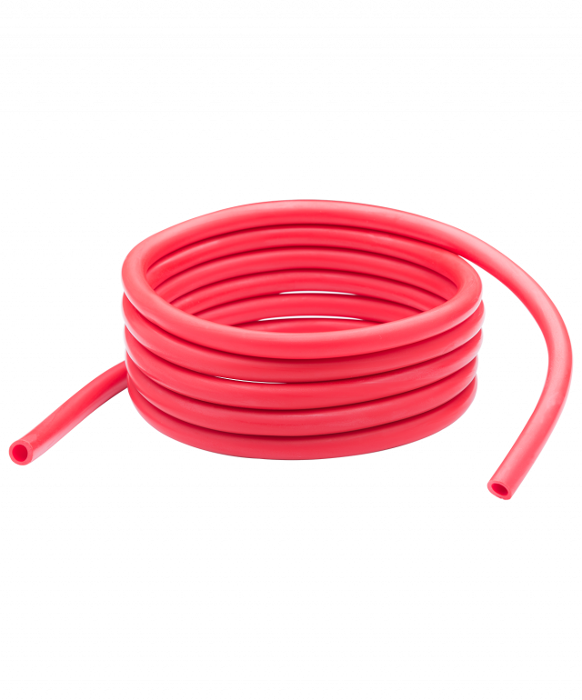 Эспандер красного цвета подойдет тем, уже заниматься с подобными резиновыми трубками меньшей нагрузки. Поможет постепенно развивать выносливость мышц.