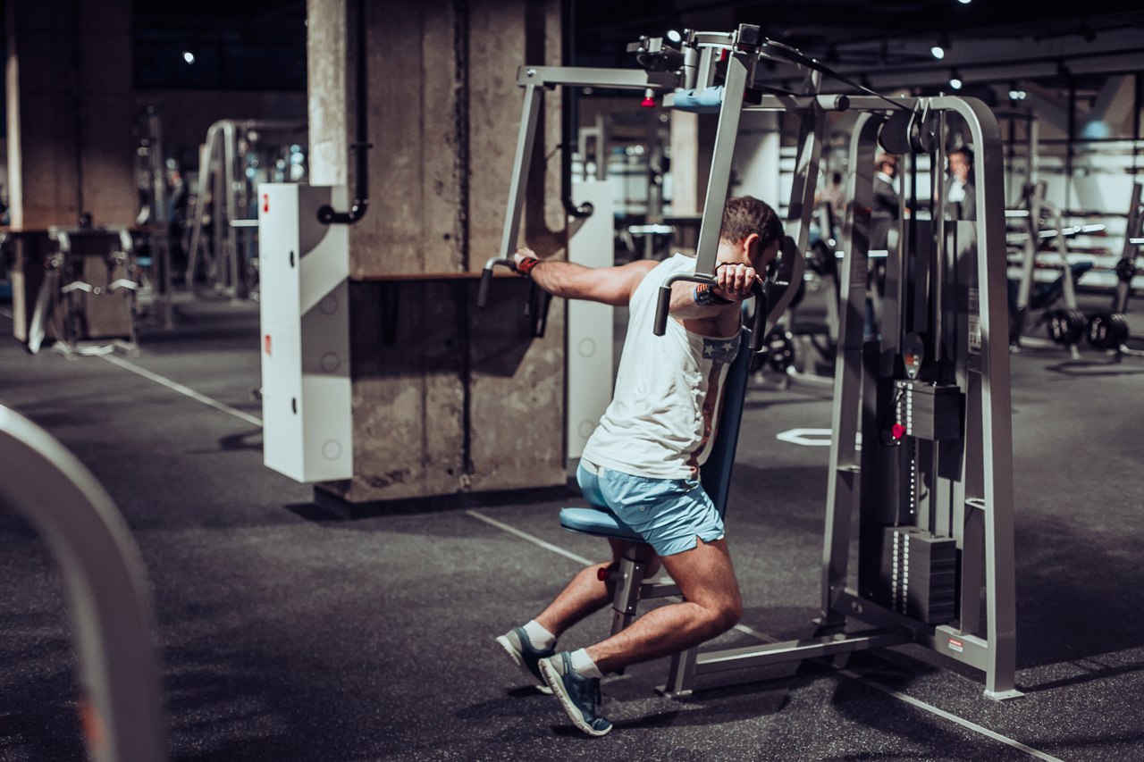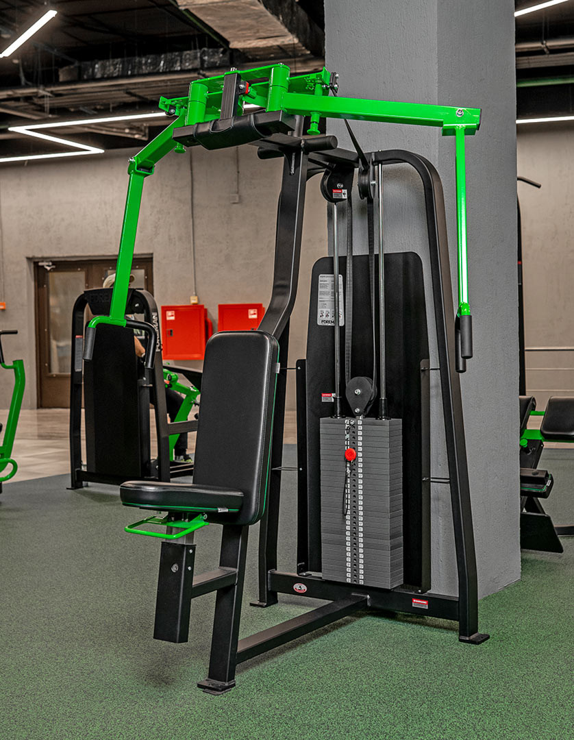 Баттерфляй. Исполняемое движение: сведение рук. Тренируемая группа мышц: большая грудная, трицепс, передние дельты.