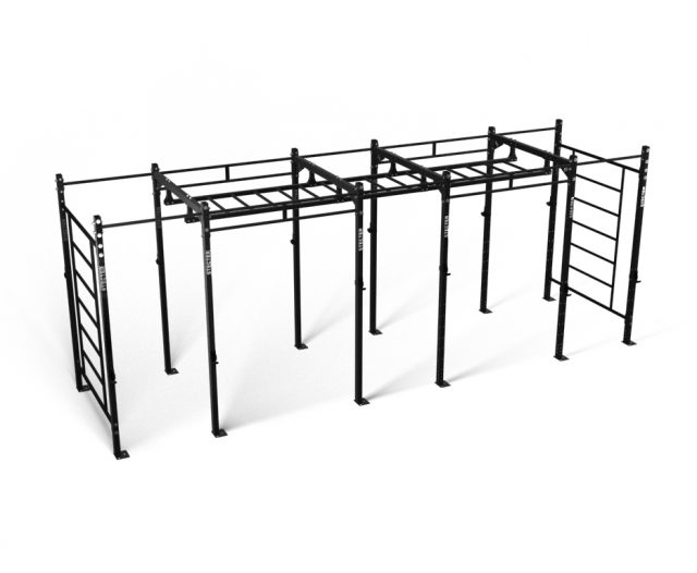 Функциональная рама для Кроссфит 6900х1800 – сборная конструкция, состоящая из десяти опорных стоек по 2810 мм в высоту, которые скреплены одинарными и двойными перекладинами длиной 1100 мм и 1800 мм. Так же в раме установлен рукоход и шведские стенки. Шесть пар J-крюков позволяют полноценно работать с штангой одновременно 6 атлетам. Стойки изготовлены из стальной профильной трубы 80х60. Толстостенные трубы (3 мм) образуют сверхпрочную конструкцию, которой не страшны любые нагрузки. В этой версии рамы использованы двойные перекладины шириной 1800 мм. Сборка рамы осуществляется посредством креплений, также входящих в комплект.