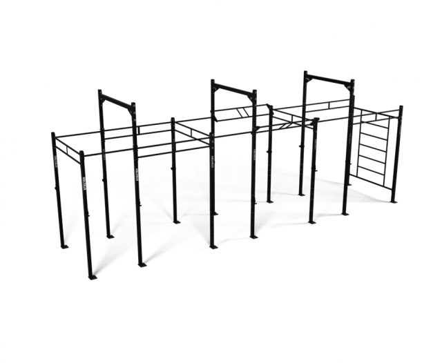 Рама для Кроссфит 8700х1800 мм состоит из шести секций, образованных четырнадцатью опорными стойками, одинарными и двойными перекладинами длиной 1100 мм и 1800 мм, а так же шведской стенкой. Стойки имеют высоту 2810 мм и 3660 мм, что позволяет крепить на них гимнастические кольца, канаты и другое оборудование. Они изготовлены из стальной профильной трубы 80х60 мм с толщиной стенки 3 мм. Все стойки прикреплены к полу. Перекладины для подтягиваний изготавливаются из круглой трубы с толщиной стенки так же 3 мм.