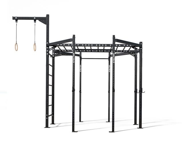 Отличная конфигурация функциональной рамы в форме восьмиугольника экономит место в зале без ущерба для количества рабочих мест атлетов. Конструкция собирается из стоек/балок сечением 80х60 мм и дополняется турниками, рукоходом, кронштейнами для различных подвесных снарядов. Наличие перфорации в стойках и балках позволяет подобрать оптимальный уровень установки элементов в кроссфит раме.