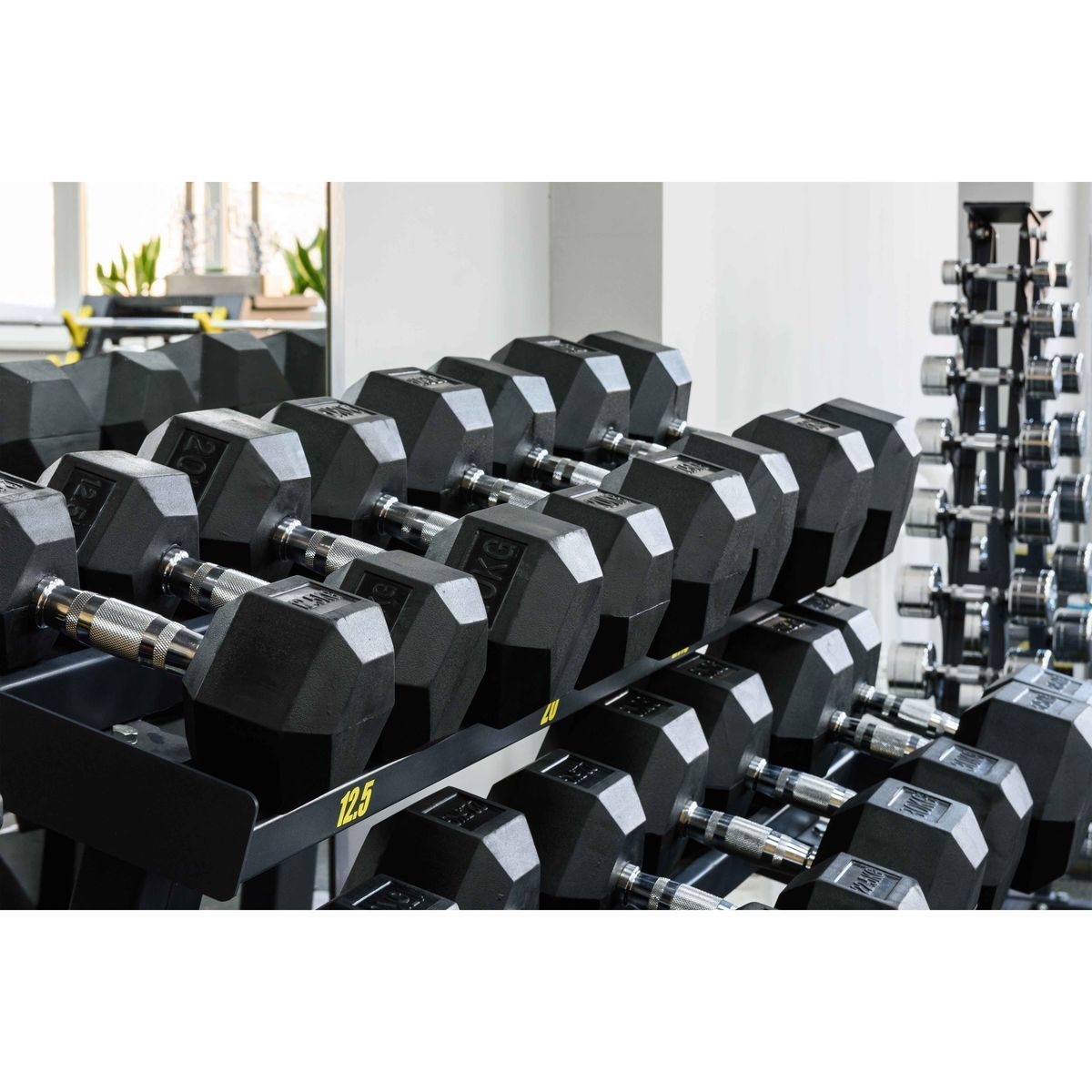 Шестиугольные грузы гантели, обеспечивающие устойчивое положение на любой поверхности, изготовлены из цельного металла.