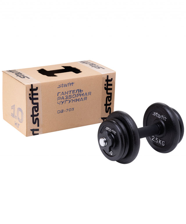 Гантель разборная чугунная DB-703 состоит из стального грифа с пластиковым хватом и чугунных дисков разного веса. Нескользящая поверхность грифа на месте хвата повышает безопасность тренировок. Широкий шаг резьбы позволяет за считанные секунды поменять вес. Гриф комплектуется пластиковыми замками, которые надежно фиксируют диски на грифе.