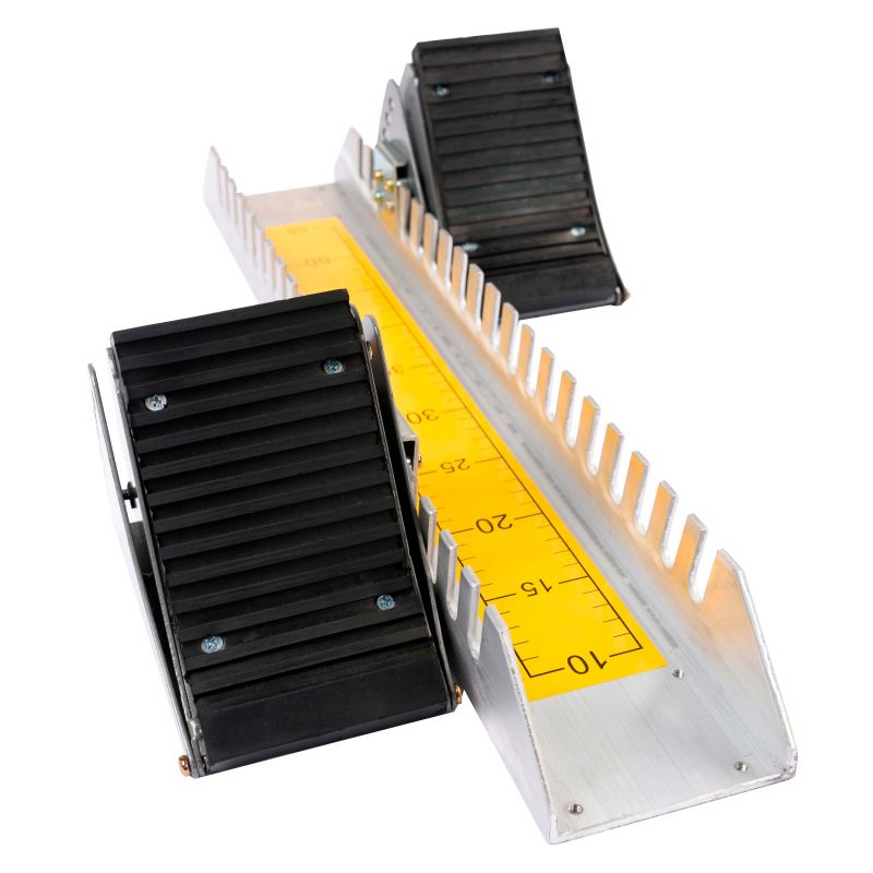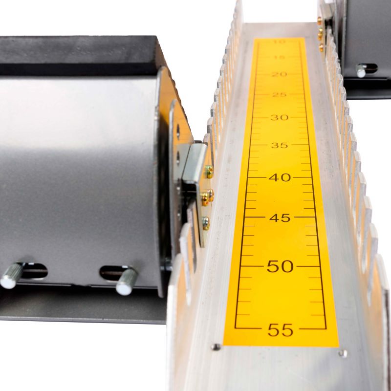 Основа выполнена из П-образного профиля 100×61×5 мм. Стартовый блок снабжен шипами для надежной фиксации блока на поверхности. Возможность регулировки угла наклона от 45-80° и длины (шаг регулировки – 25 мм, длина — до 550 мм). Поверхность опор колодок покрыта специальным анти-скользящим резиновым слоем.