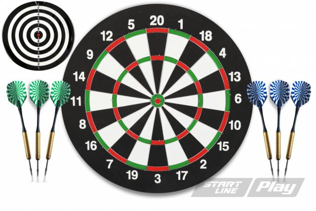 Комплект включает набор дротиков 6 шт x 16 гр (3 дротика с синим хвостовым оперением и 3 с зеленым хвостовым оперением).