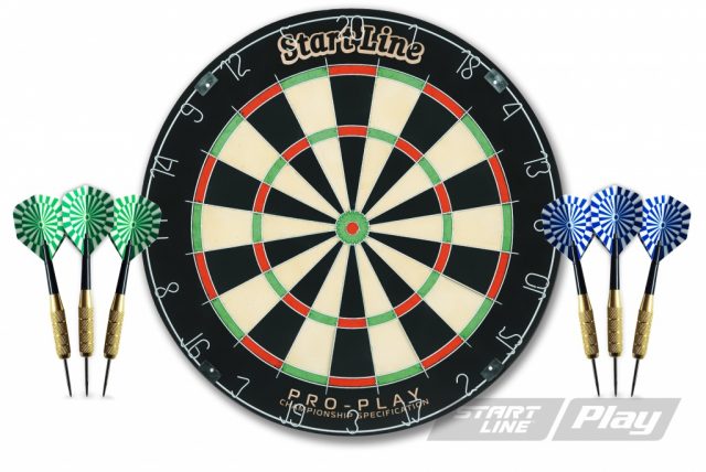 Комплект включает собранные дротики с латунным покрытием высокого качества 6 шт x 18 гр (3 дротика с синим хвостовым оперением и 3 с зеленым хвостовым оперением), а также крепление для подвешивания к стене.