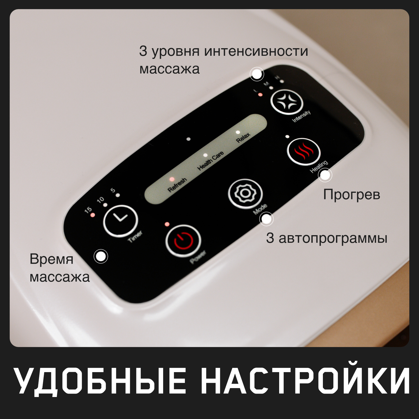 Все необходимые кнопки управления вынесены на корпус. С консоли можно выбрать программу, ее интенсивность и запустить прогрев. Для регулировки длительности сеанса есть кнопка таймера: нажмите ее, чтобы выбрать 5, 10 или 15 минут. По умолчанию сеанс длится 10 минут.