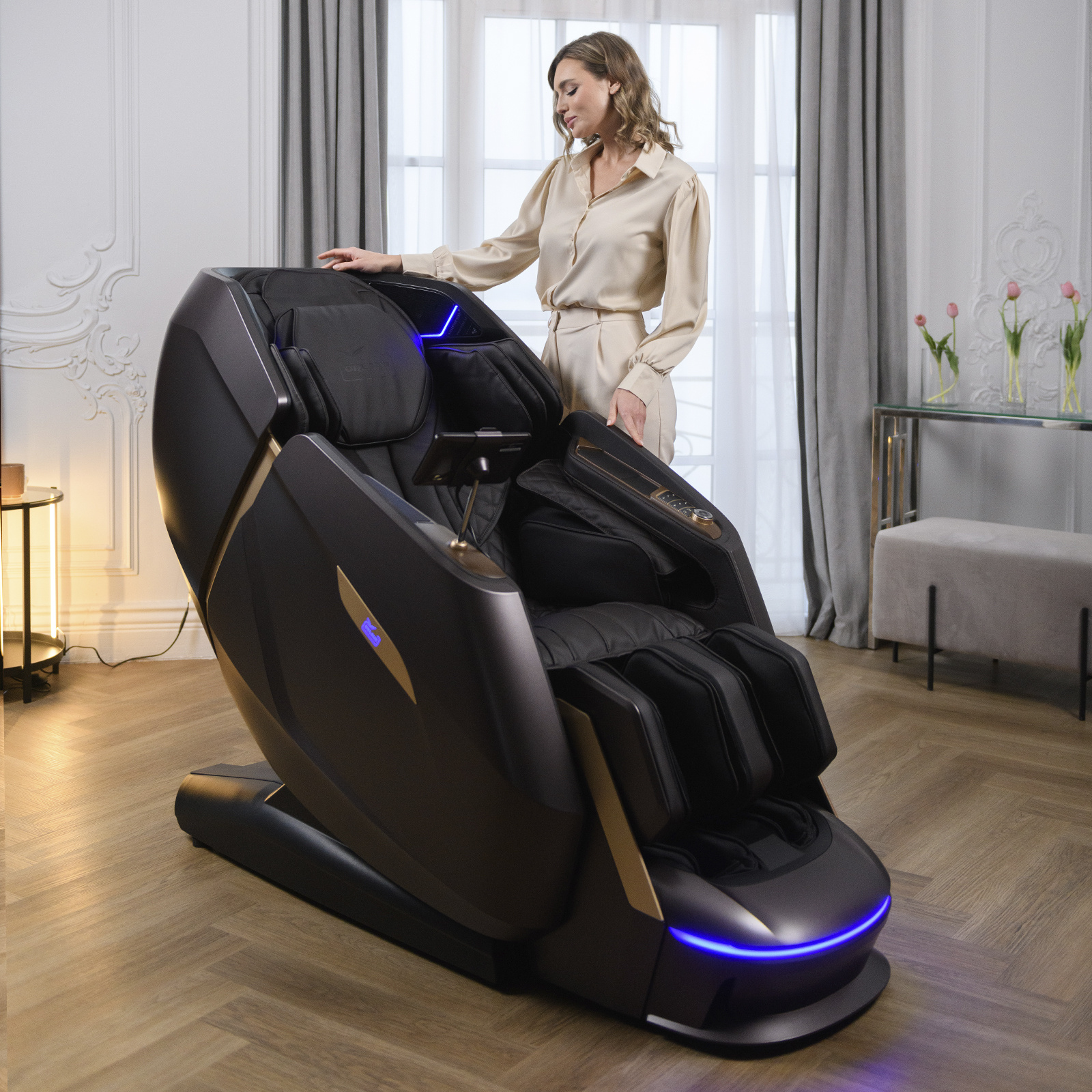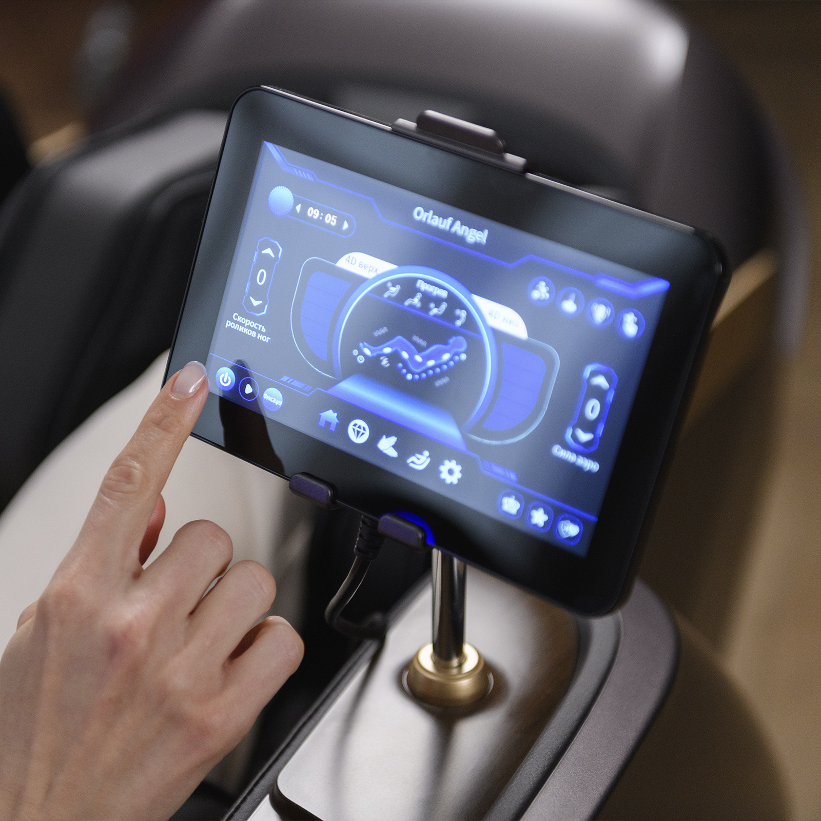 Модель Orlauf Angel дополнена рядом приятных опций, включая встроенные Bluetooth-колонки, систему ароматерапии и ионотерапии, беспроводную зарядку и USB-порт. Уникальная функция определения состояния здоровья измеряет ключевые показатели, такие как ЧСС, уровень кислорода, степень усталости и качество микроциркуляции.