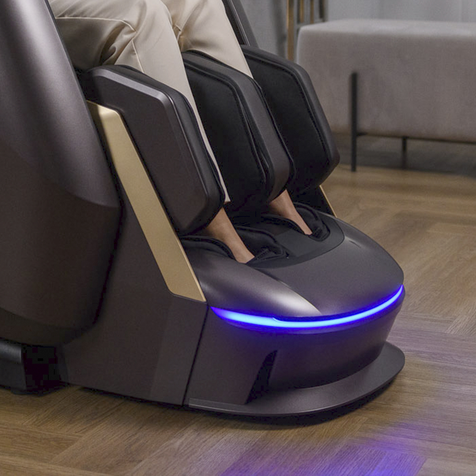 Количество роликов в массаже ног: Четырёхрядные увеличенные ролики в икрах, 6 массажных блоков в стопах