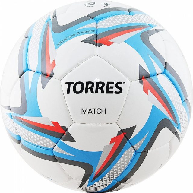 Главная страница » Магазин » Мяч футбольный TORRES Match цв.белый-серебристый-голубой р.4
