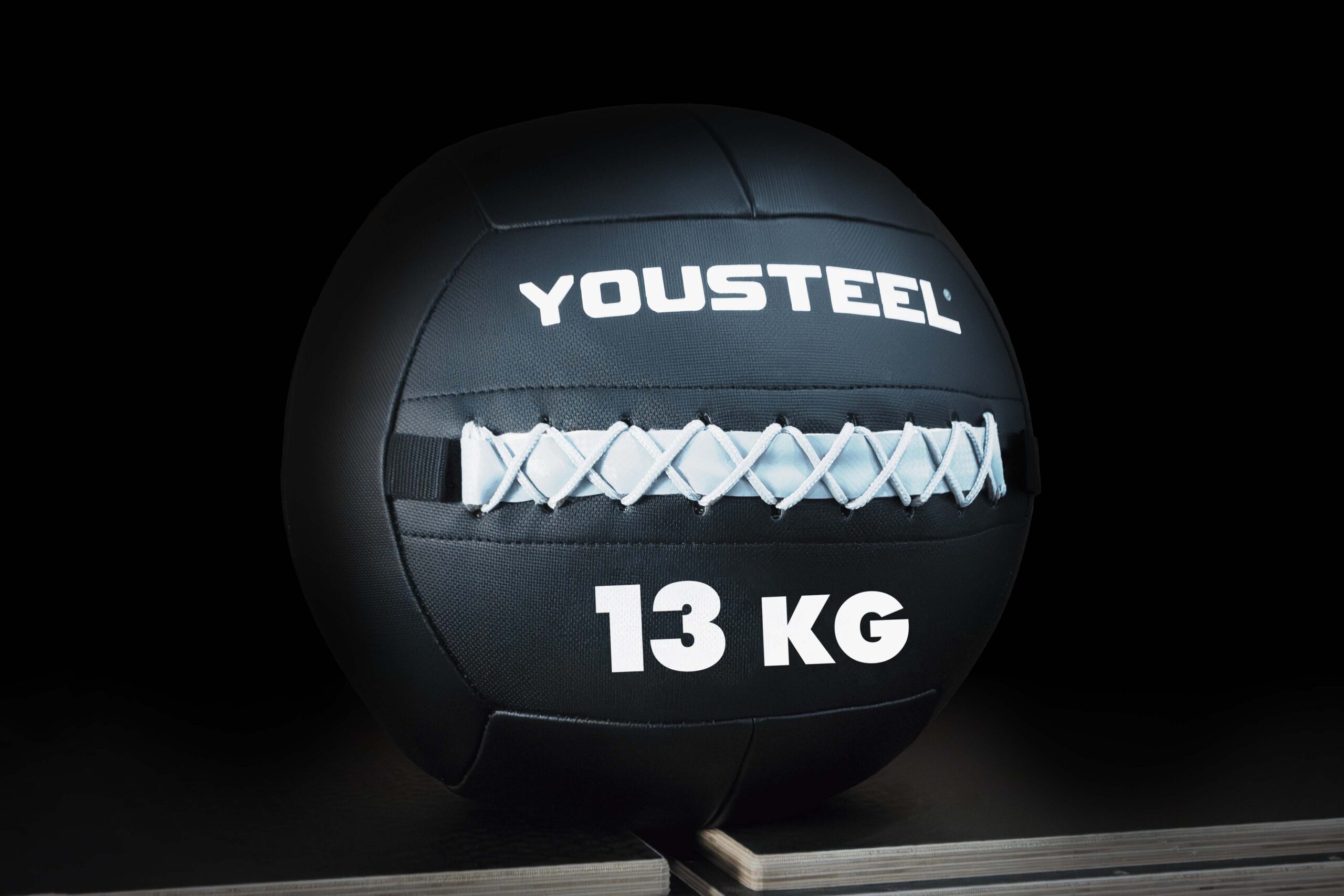 Медбол представляет собой утяжеленный мяч, диаметром 355мм и весом 13кг. Оболочка мяча выполнена из износостойкого ПВХ, которое обеспечивает оптимальное сцепления с ладонями занимающихся и предотвращает выскальзывание из рук, даже если вы вспотели. Для простоты ориентации каждый снаряд имеет цифровое обозначение веса и цветную вставку. Каждый шов прошивается нейлоновой нитью, что обеспечивает повышенную надёжность. Уникальность мячей в том, что мы используем внутри систему «скорлупы». Под оболочкой из ПВХ находится мягкий слой из вспененного полиуретана высокой плотности, который служит для предотвращения смещения центра тяжести, это происходит за счет концентрации тяжелых частиц набивки в самом центре ядра «скорлупы» мяча.
