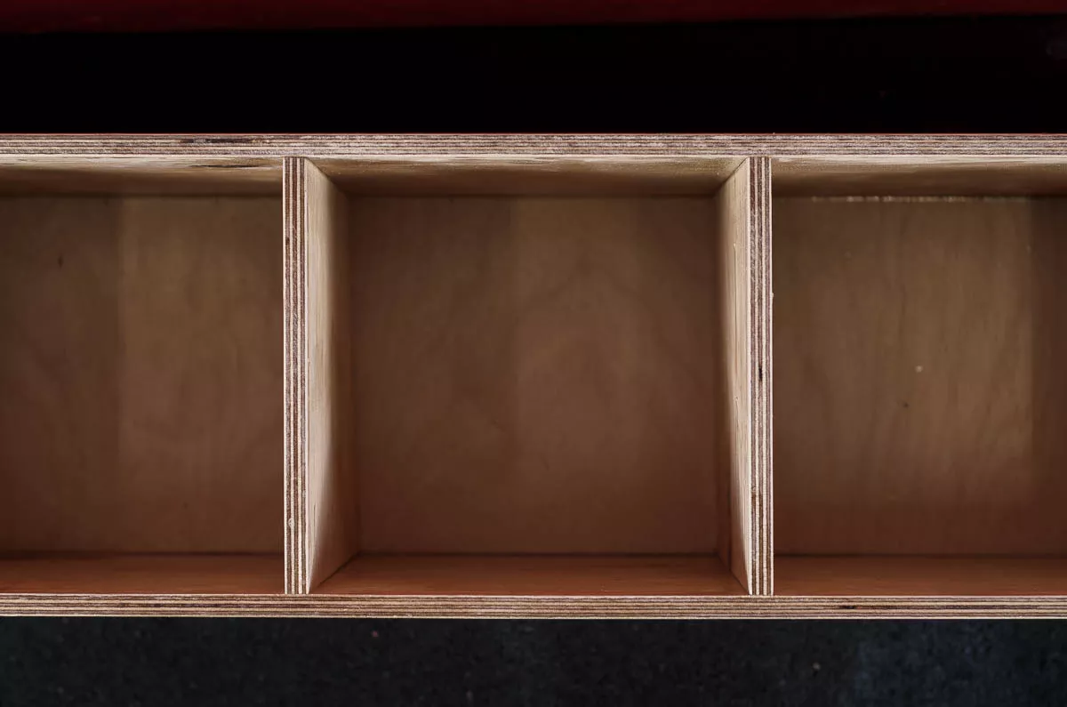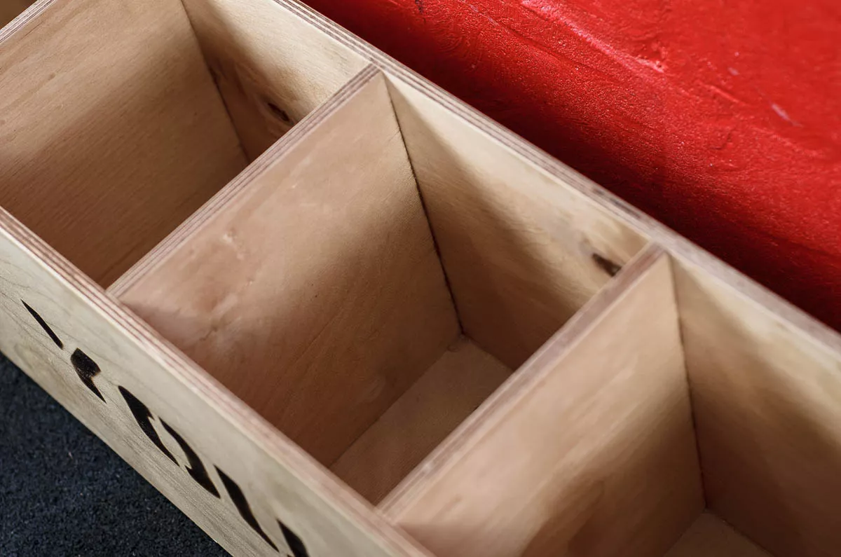 Подставка представляет собой фанерный ящик длиной 1090мм с шестью квадратными отсеками 170х170мм, достаточно широкими и глубокими, чтобы уверенно удерживать роллер. В отделениях ящика Вы также можете хранить замки, резиновые петли и прочие мелкие аксессуары. Подставка покрыта лаком, который защищает фанеру от внешнего воздействия.