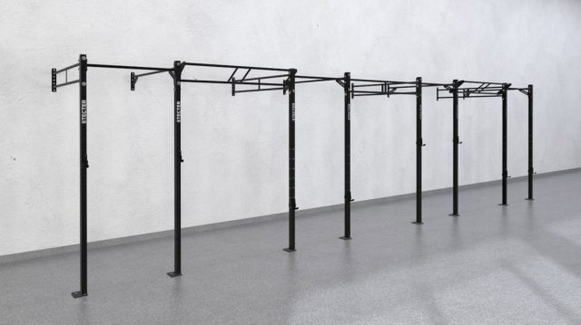 Пристенная рама для Кроссфит длиной 9,8 метра и шириной 1,8 метра состоит из семи секций. Восемь стоек высотой 2810 мм соединены перекладинами и балками. В комплект входит набор различных перекладин и балок длиной 1100 мм и 1800 мм. Конструкция собирается при помощи болтовых соединений. Все стойки прикрепляются к полу, перекладины также крепятся свободными концами к стене. Стойки произведены из профильной трубы 80х60 мм. Толщина металла, из которого изготовляются части рамы, — 3 мм. Высота и запас прочности конструкции позволяют крепить к ней гимнастические кольца и канат.