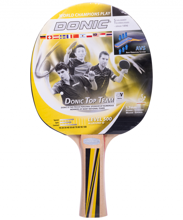 Ракетка Top Team 500 от всемирно известного немецкого бренда Donic-Schildkröt прекрасно подходит игрокам, знакомым с базовой техникой игры. Благодаря технологии AVS (Anti-Vibration-System) достигается улучшенный контроль мяча и снижение вибраций, вызванных ударом мяча, в результате чего повышается точность попаданий.