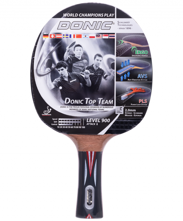Ракетка Top Team 900 от всемирно известного немецкого бренда Donic-Schildkröt прекрасно подходит для продвинутых игроков, владеющих сложными техниками. Эргономическая форма рукоятки позволяет избежать давления в руке максимального комфорта в игре. Благодаря технологии AVS (Anti-Vibration-System) достигается улучшенный контроль мяча и снижение вибраций, вызванных ударом мяча, в результате чего повышается точность попаданий. PLS-технология помогает добиться максимальной скорости игры за счет снижения веса рукоятки и смещения центра тяжести к центру головы ракетки.