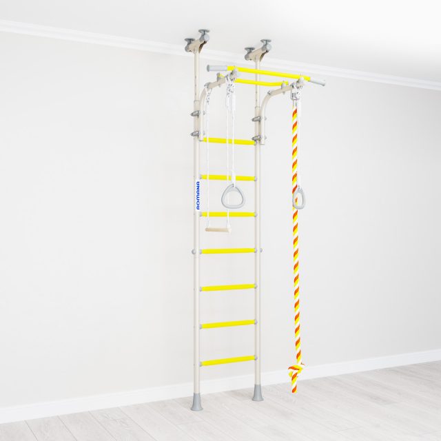 Детский спортивный комплекс ROMANA R5 Kometa — современная шведская стенка с возможностью установки враспор к полу и потолку. Не нужно сверлить стену и крепить к ней раму. Металлокаркас стенки рассчитан на вес в 100 кг (испытан нагрузкой в 200 кг).