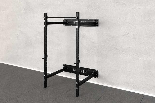 Для установки складной рамы для кроссфита необходимо прикрепить к стене специальные панели с поворотными шарнирами. Данные шарниры позволяют закрепить опорные стойки и складывать их к стене внутрь или наружу рамы. Стойки фиксируются в шарнирах при помощи специального фиксатора с дополнительной защитой от случайного «вылета» из отверстий – это дает двойную надежность соединению.