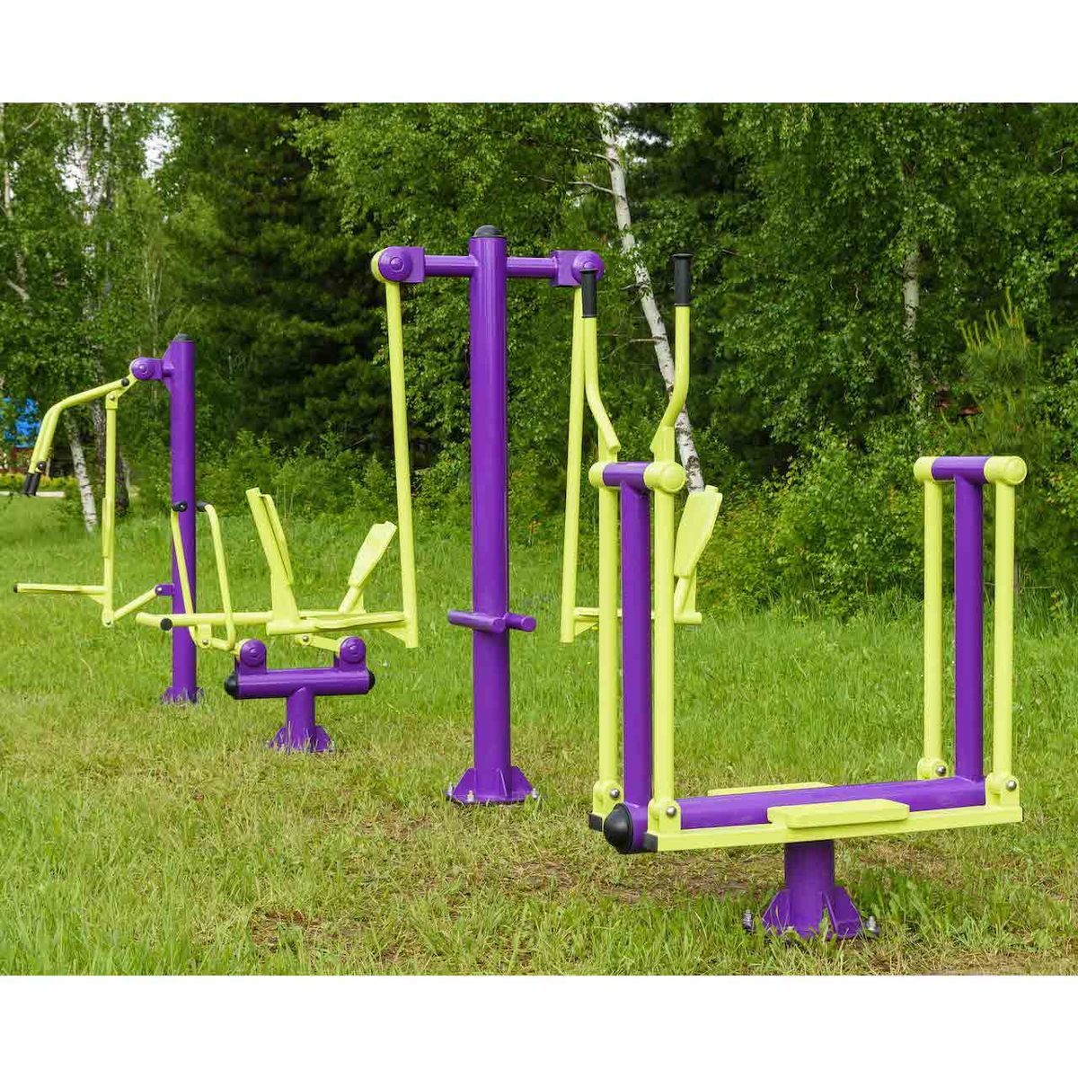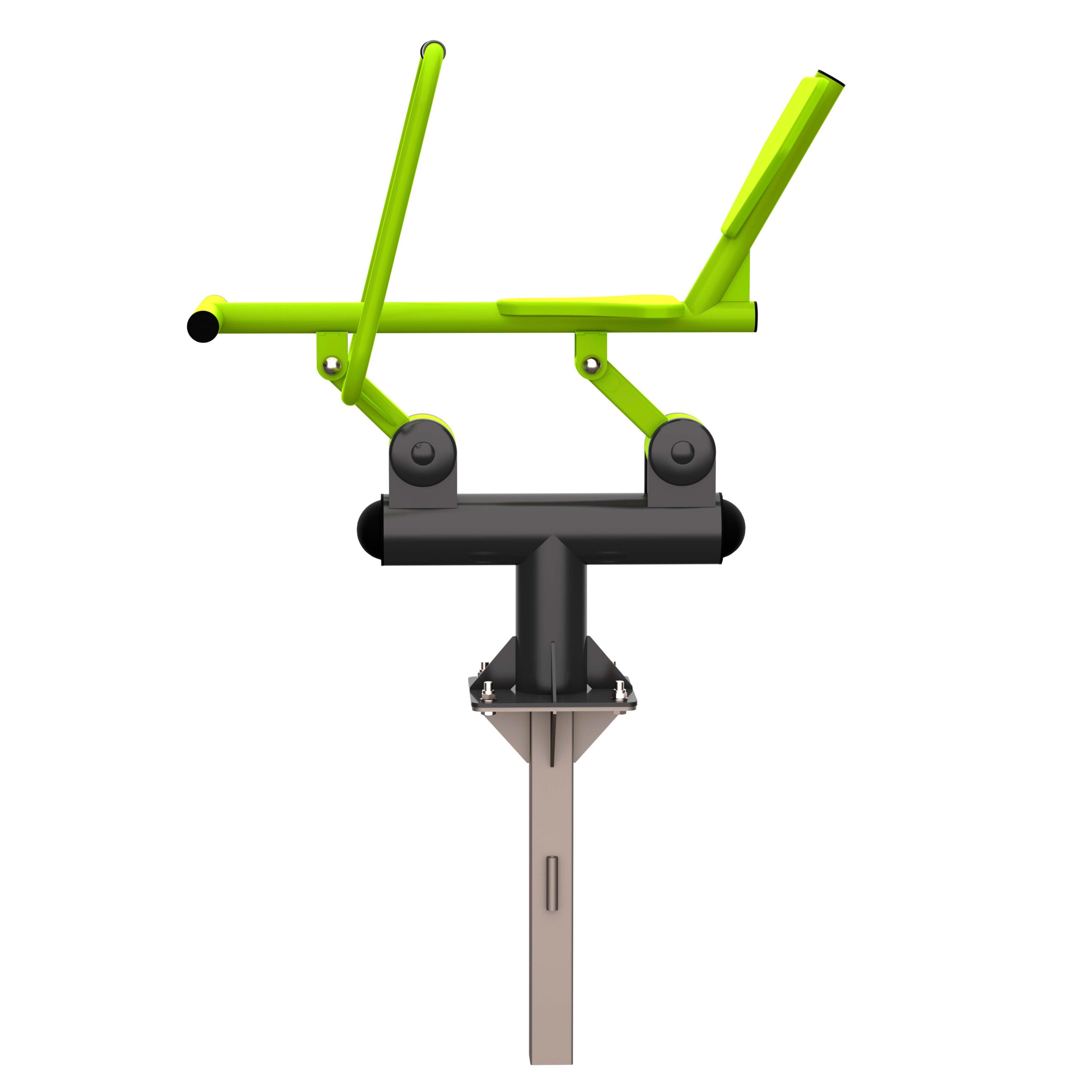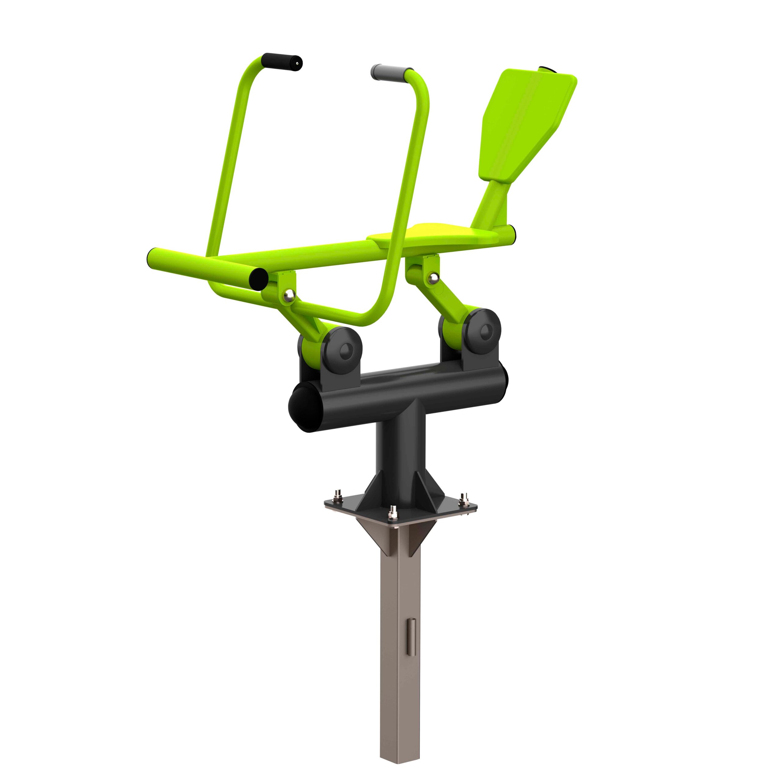 Оборудование состоит из опорного столба, сиденья со спинкой и упором для ног, рычага с рукоятями и закладной. Закладная монтируется в грунт и заливается бетоном. Опорный столб крепится к закладной за счет фланцевого соединения и отсыпается песчано-гравийной смесью до уровня площадки. Фланцевое крепление позволяет надёжно смонтировать оборудование и беспрепятственно демонтировать при необходимости обслуживания. Монтажные схемы прилагаются к комплекту поставки.