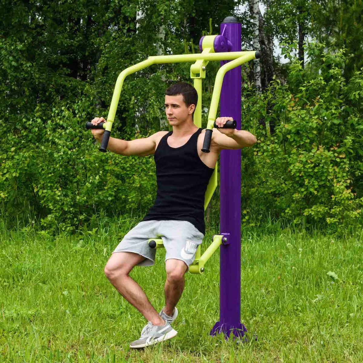 Уличный тренажер Жим от груди ZAVODSPORTA* предназначен для установки на уличных спортивных площадках с учетом интенсивной эксплуатации в разных климатических условиях.