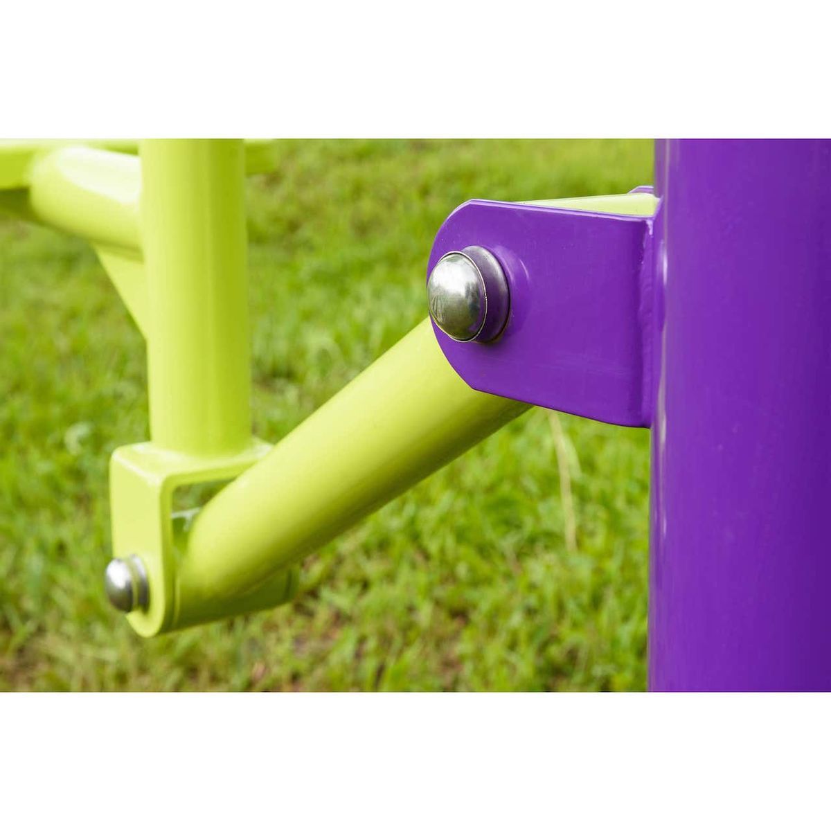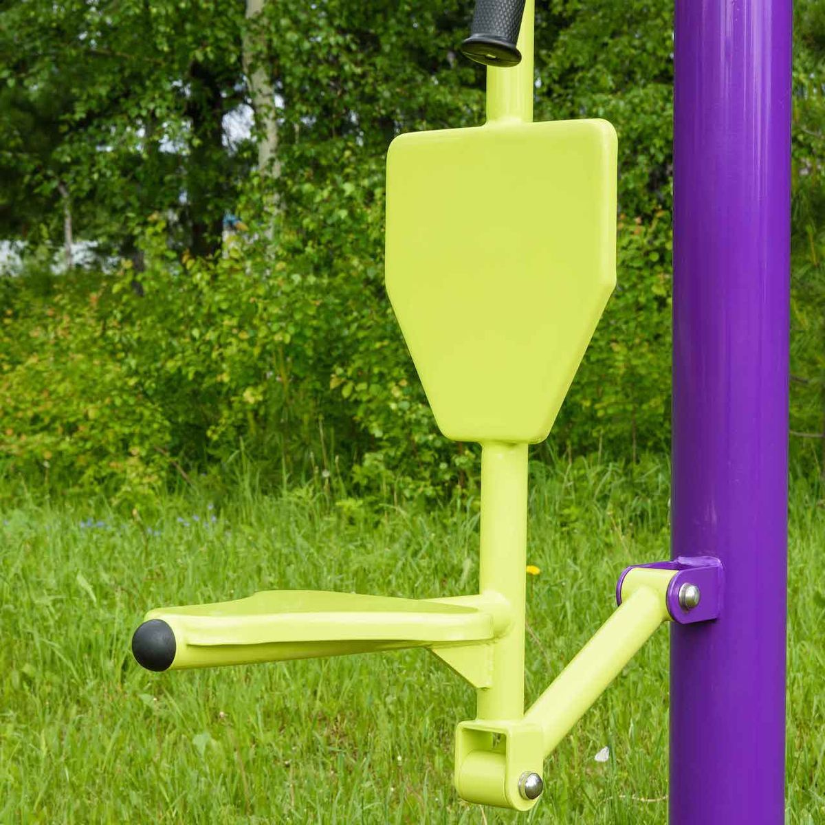 Фланцевое соединение опорного столба с закладной производится через четыре овальных отверстия размером 22×30 мм, расположенных на расстоянии 240 мм. Овальные отверстия под болтовое крепление М16 позволяют дополнительно регулировать положение тренажера. Резьбовые соединения защищены составными металлическими колпачками, входящими в комплект поставки.