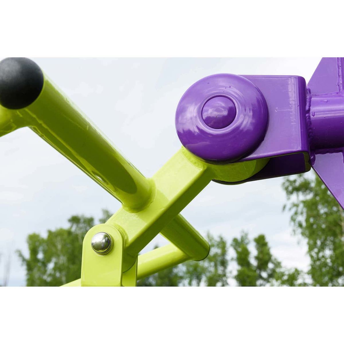 Оборудование состоит из опорного столба, сиденья со спинкой, рычага с рукоятями и закладной. Закладная монтируется в грунт и заливается бетоном. Опорный столб крепится к закладной за счет фланцевого соединения и отсыпается песчано-гравийной смесью до уровня площадки. Фланцевое крепление позволяет надёжно смонтировать оборудование и беспрепятственно демонтировать при необходимости обслуживания. Монтажные схемы прилагаются к комплекту поставки.