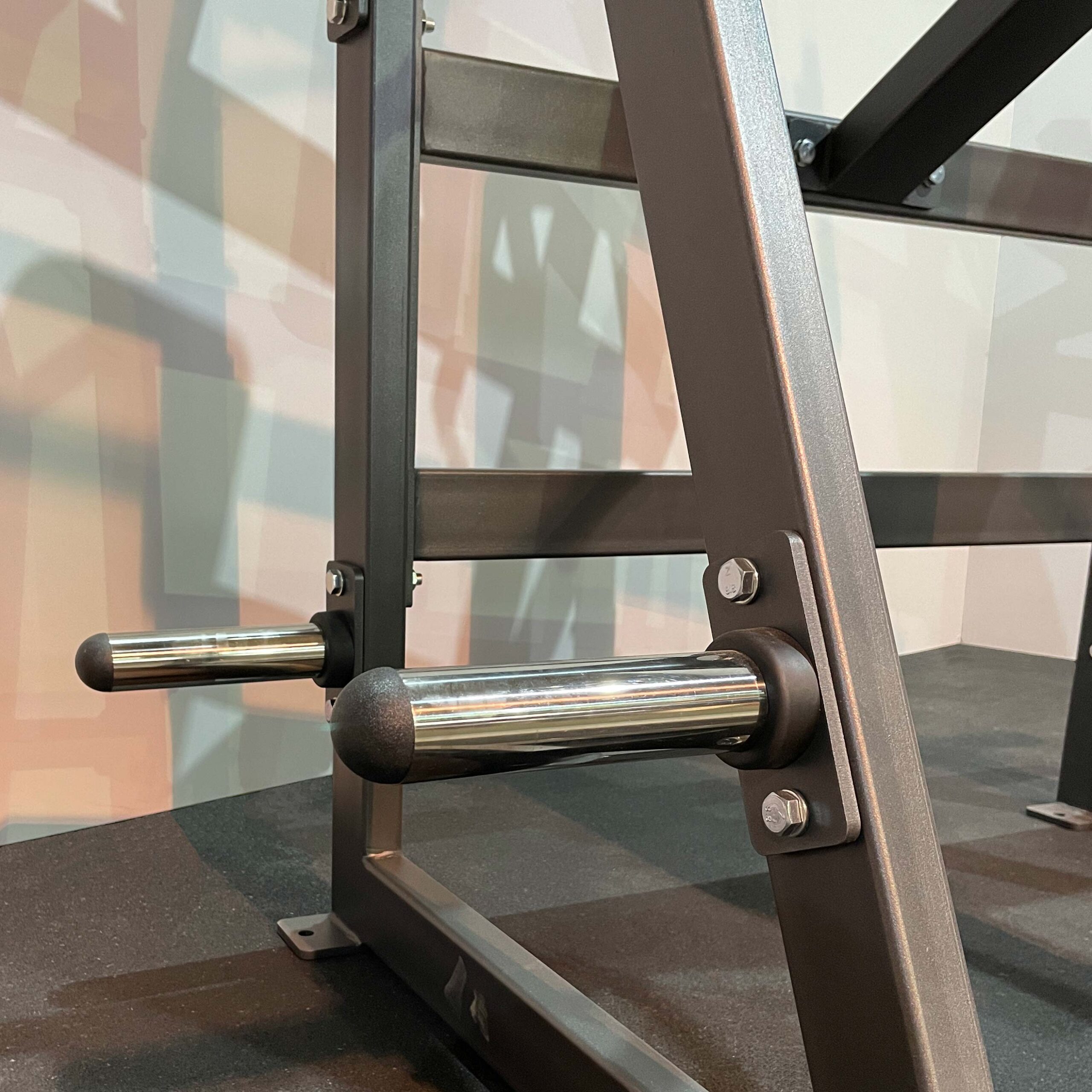 Два хромированных накопителя под углом на подвижных рычагах и шесть хромированных накопителей для хранения свободных весов изготовлены из толстостенной стальной трубы. На торцах накопителей установлены заглушки из пластика.