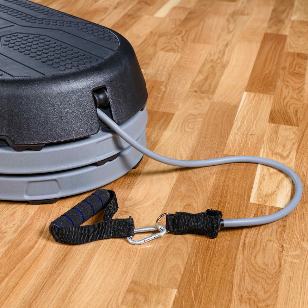 В комплекте с платформой также идет эспандер, который легко устанавливается на степ и делает тренировку наиболее эффективной.