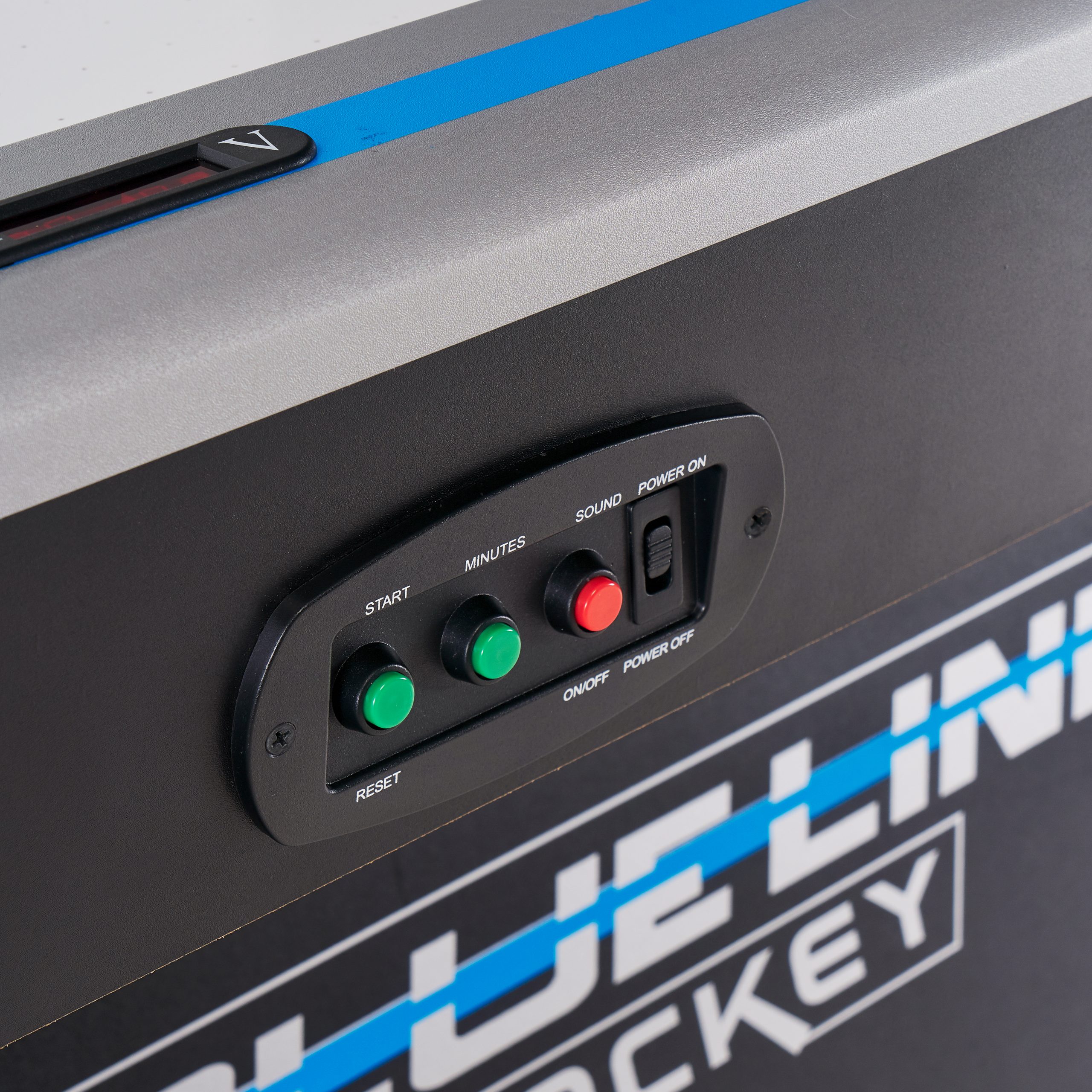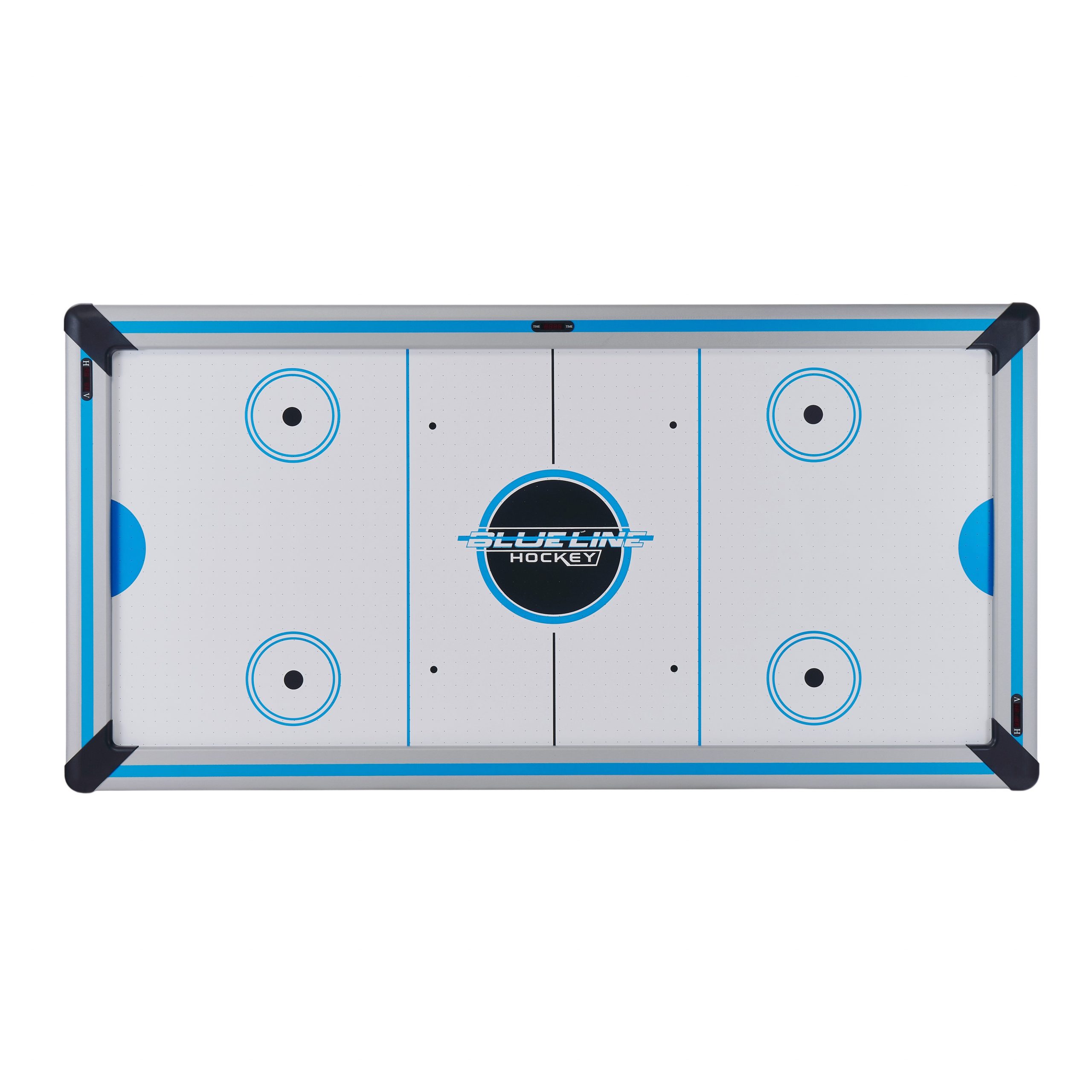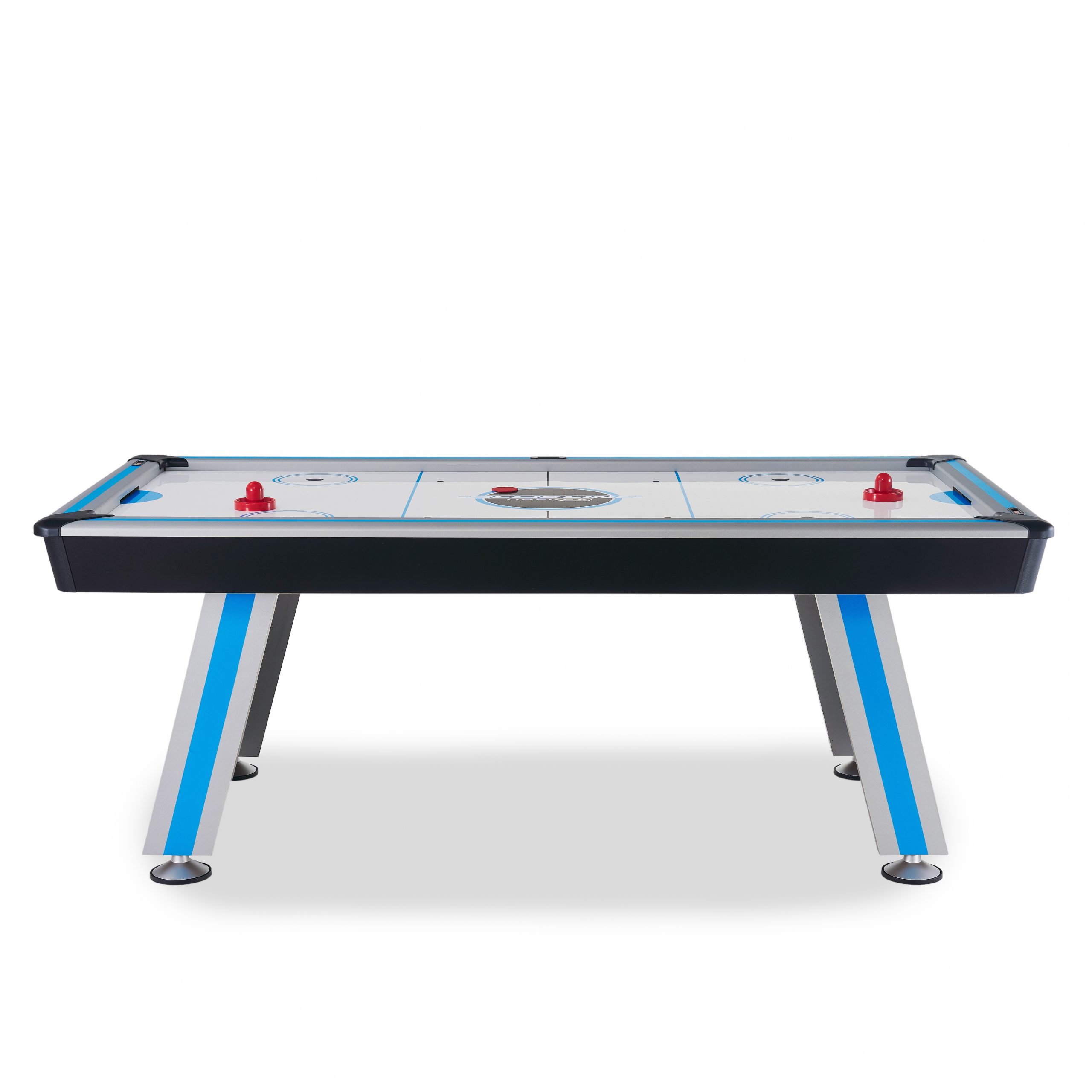 Стол оборудован электронным табло для подсчета очков и комплектуется набором аксессуаров (две биты и две шайбы).