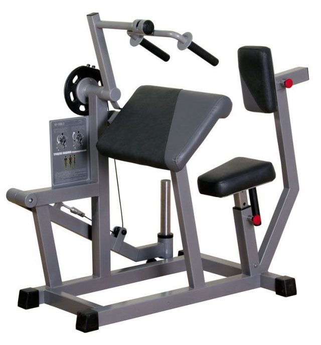 Профиль несущей конструкции 60х60х3 (мм). Тренажер окрашивается порошковой краской. Сидение изготовлено из многослойной фанеры (20 мм), в качестве наполнителя и обивки используется двухслойный пенополиуретан, устойчивый к усадке и высококачественная искусственная кожа. Регулировка сиденья и спинки позволяет заниматься на тренажере людям с разными ростовыми характеристиками. Для удобства регулировки сидение снабжено пневмоамортизатором. Скрытая система подшипников и амортизаторов обеспечивает плавность хода и шумопоглащение. Рукоятки силовых рычагов максимально приближают естественную амплитуду движения и создают дополнительный комфорт при выполнении упражнения. Тренажер оснащен информационной табличкой по выполнению упражнения, памяткой технического обслуживания, амортизирующими подпятниками, не требующими крепления к полу.