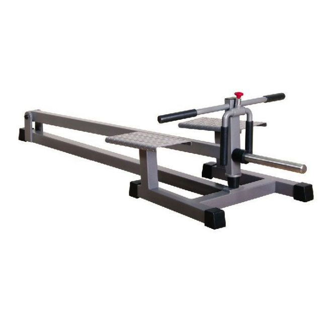 Тренажер — т-образная тяга с упором на ноги (свободные веса).