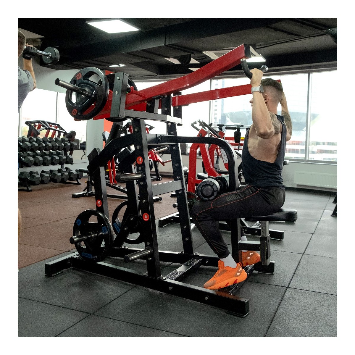 Область применения: Профессиональная;Форма сечения рамы: Прямоугольная|Квадратная;Толщина стенки рамы: 3 мм;Диаметр втулки для дисков: 50 мм;Размеры тренажера: 165 х 155 х 201 см;Вес тренажера: 218 кг