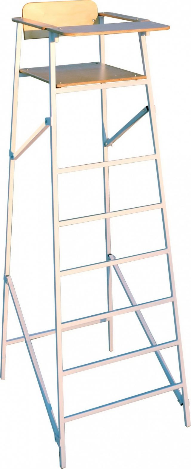 Каркас судейской вышки изготавливается из стальной профильной трубы сечением 25х25х1,5 мм и покрыта полимерной краской. Укомплектовано сиденьем, спинкой, подлокотниками и столиком изготовленные из фанеры, крепление осуществляется к каркасу вышки судейской при помощи болтов мебельных М8х40 мм. Во все торцы профильной трубы установлены пластиковые заглушки. Крепление фанеры осуществляется на месте сборки вышки судейской.