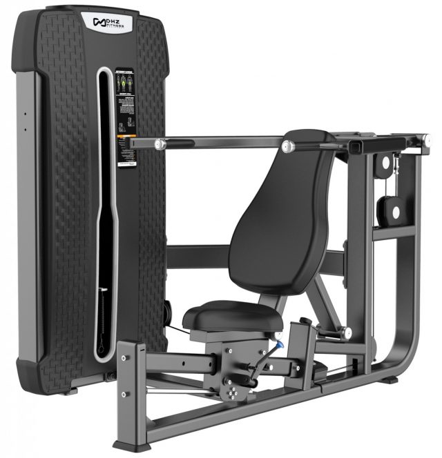- Металлическая перфорированная защита весового стека с лицевой стороны и сплошная защита с задней стороны выполнена из листового металла толщиной 2 мм. Ребра жесткости у основания, примыкающие к несущей раме через скрытое болтовое соединение сечением 6 мм в восьми точках, повышают эксплуатационные параметры тренажера.