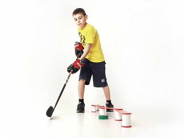 Тренажер предназначен для тренировки на синтетическом льду, в зале и на льду с использованием простой шайбы, а также на любом ровном покрытии с использованием зеленой шайбы, шведского шара (шар для дриблинга) или шара для мышц.
